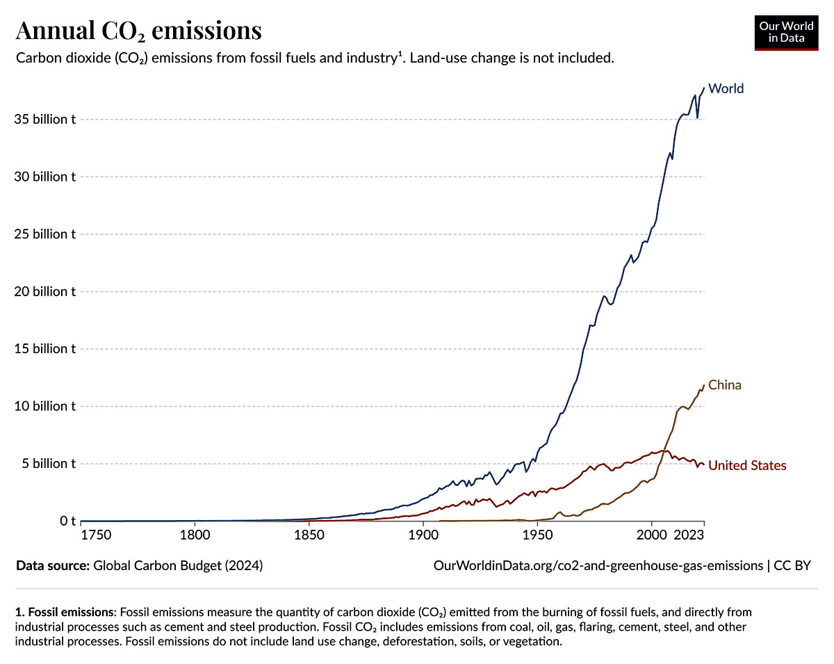 <iframe src=”https://ourworldindata.org/grapher/annual-co2-emissions-per-country?country=OWID_WRL~CHN~USA&tab=chart” loading=”lazy” style=”width: 100%; height: 600px; border: 0px none;” allow=”web-share; clipboard-write”></iframe>