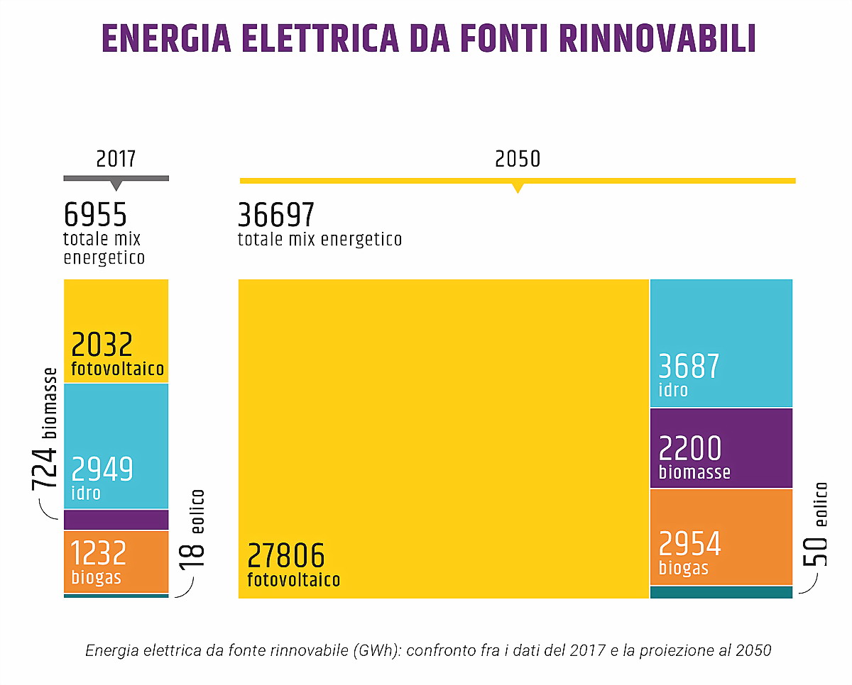 Quanto ipotizzato nel report «Veneto 100% sostenibile» prevede un sostanziale raddoppio del fabbisogno elettrico (al netto dei consumi industriali). Per rispondere a questa domanda sarà necessario ricorrere alle fonti rinnovabili con il fotovoltaico in primis. Si renderà dunque necessario moltiplicare per 8 volte l’attuale potenza fotovoltaica installata, a parità di rendimento di conversione, con un incremento di 14,7 GW. Per farlo dovrà essere creato un grande polmone solare pari a circa 12.000 ettari di superficie (lo 0,65% del territorio regionale). Ai costi attuali la copertura del fabbisogno elettrico al 2050 comporterà in 30 anni un investimento complessivo di 20,1 miliardi di euro.