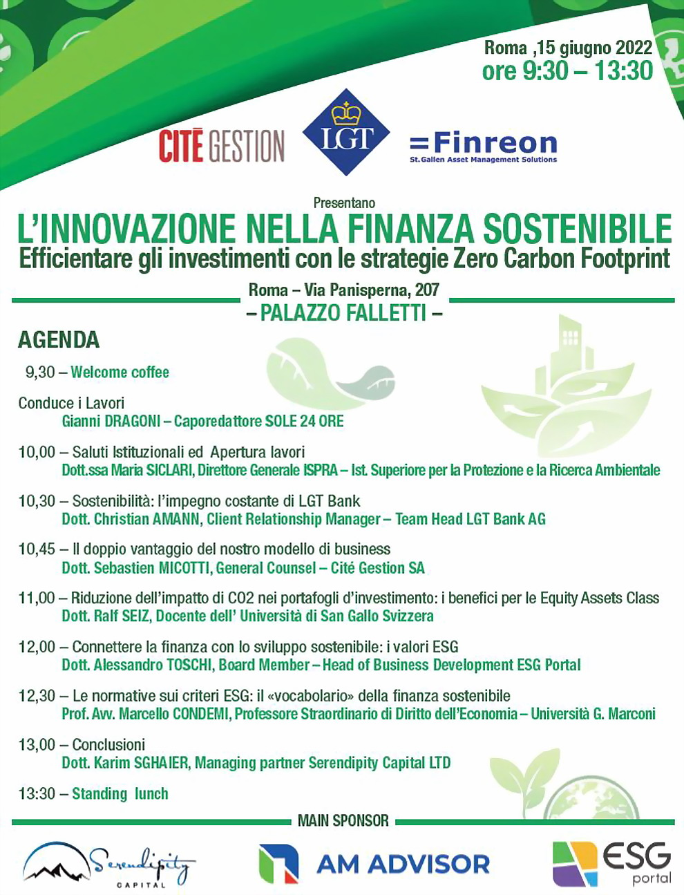 Tra i relatori del convegno che parleranno di finanza sostenibile e di investimenti green figurano eccellenze del settore: Ralf Seiz,  economista svizzero CEO di Finreon e docente dell’Università San Gallo, Sebastien Micotti, General Counsel di Cité Gestion, Christian Amann, Client Relationship Manager di LGT Bank, Maria Siclari, Diretore Generale dell’ISPRA (Istituto Superiore per la Protezione e la Ricerca Ambientale), Alessandro Toschi, Board Member di ESG Portal, Karim Sghaier, Managing partner di Serendipity Capital, Marcello Condemi, docente dell’Università G. Marconi.