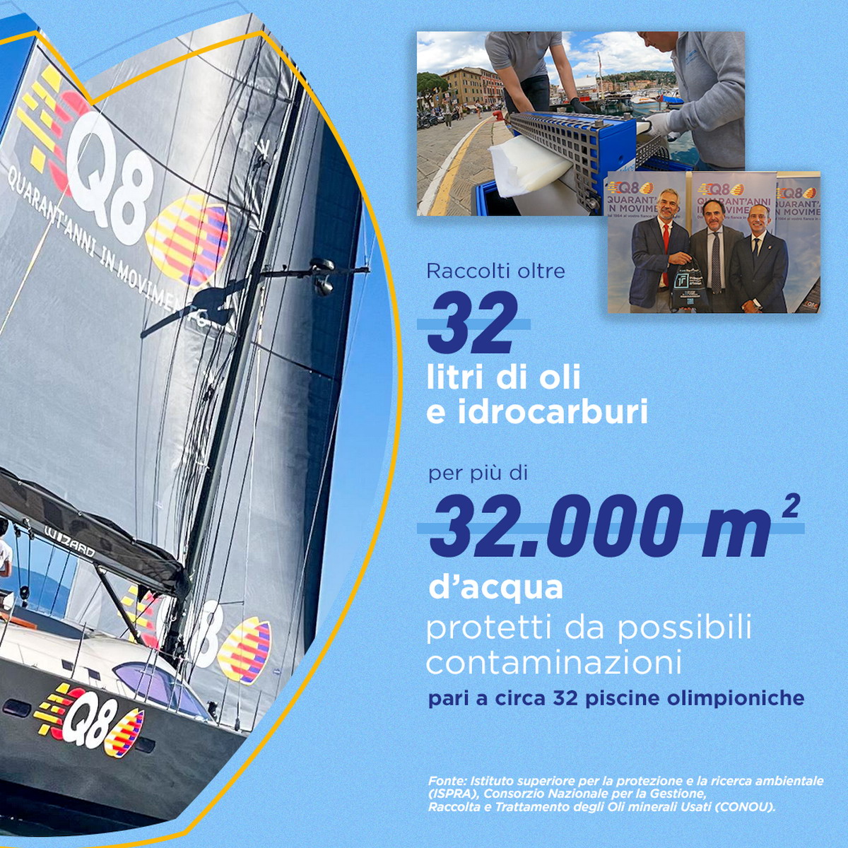 Grazie alla distribuzione di speciali kit anti-sversamento, il progetto ambientale di Q8, nato in collaborazione con LifeGate, ha permesso la raccolta di oltre 32 litri di oli e idrocarburi, equivalenti a più di 32 milioni di litri d’acqua protetti da possibili contaminazioni. Questo in 45 porti italiani