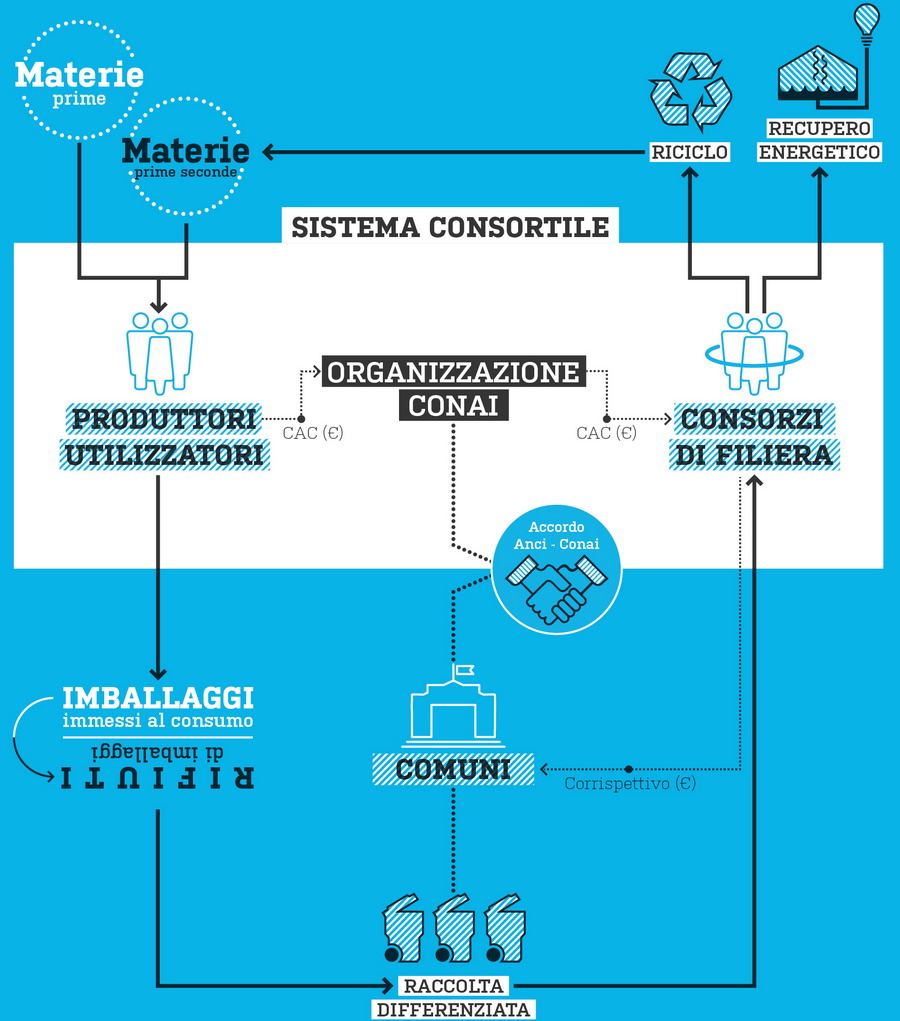 CONAI lavora a stretto contatto con i Comuni, assicurando l’avvio a recupero e riciclo dei rifiuti di imballaggio di acciaio, alluminio, carta, legno, plastica e vetro, e garantendo un effettivo sbocco nella filiera del riciclo e del recupero ai materiali provenienti dalla raccolta urbana.