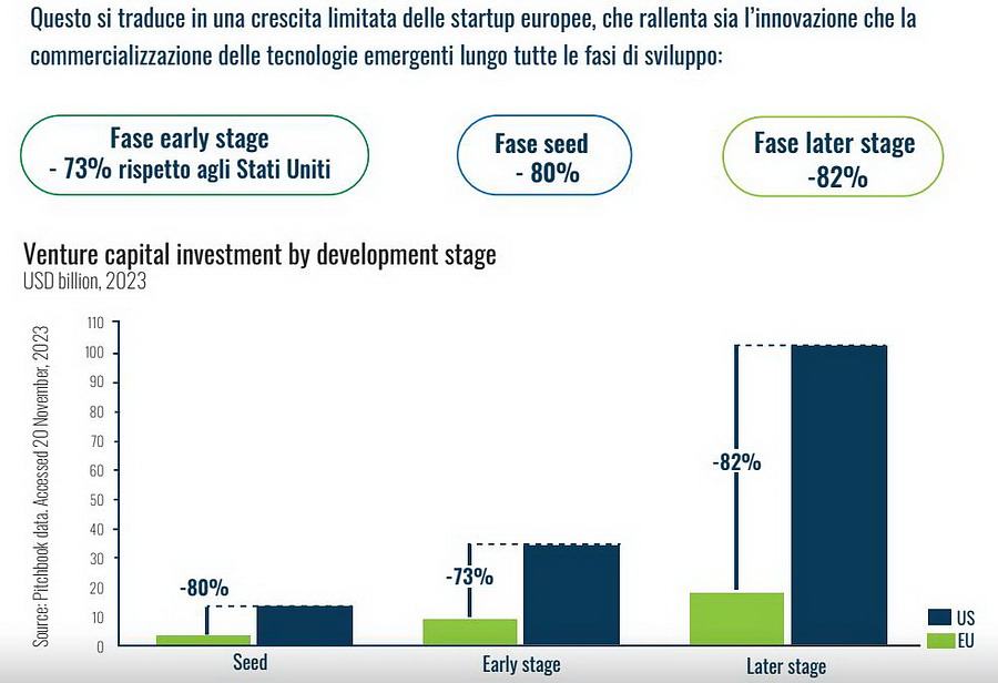 Nonostante un investimento di 387 miliardi di euro in ricerca e sviluppo (R&S) nel 2023 – concentrato soprattutto nel settore automobilistico – l’Europa resta indietro rispetto ai 928 miliardi degli Stati Uniti e ai 419 miliardi della Cina, più orientati al digitale. Il gap si riflette anche nel venture capital: nel 2024, dei 368,5 miliardi di dollari investiti globalmente, il 59% è andato agli USA, il 21% alla Cina e solo il 17% all’Europa. Il ritardo è evidente anche nel trasferimento tecnologico: nel 2021 l’Europa ha rappresentato appena il 17% delle domande di brevetto globali, contro il 21% degli USA e il 25% della Cina. Questa carenza di investimenti frena la crescita delle startup e rallenta innovazione e commercializzazione delle tecnologie emergenti. In particolare, in Europa gli investimenti di venture capital nelle fasi early-stage, seed e later-stage sono inferiori rispettivamente del 73%, 80% e 82% rispetto agli USA, evidenziando l’urgente necessità di un maggiore supporto all’innovazione.