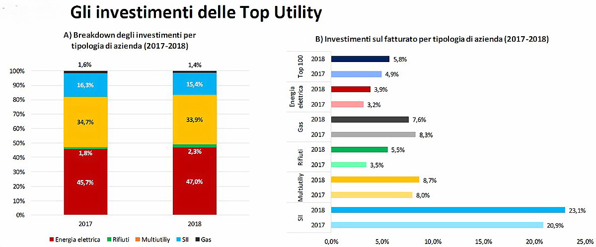 Le principali utility italiane, sempre maggiormente interessate agli investimenti, fanno registrare un incremento degli stessi del 18,7% nel 2018 generandone per oltre 6,6 miliardi di euro e producendo essi stessi un valore pari allo 0,3% del PIL corrispondente, in sostanza, alla crescita complessiva della nostra economia.