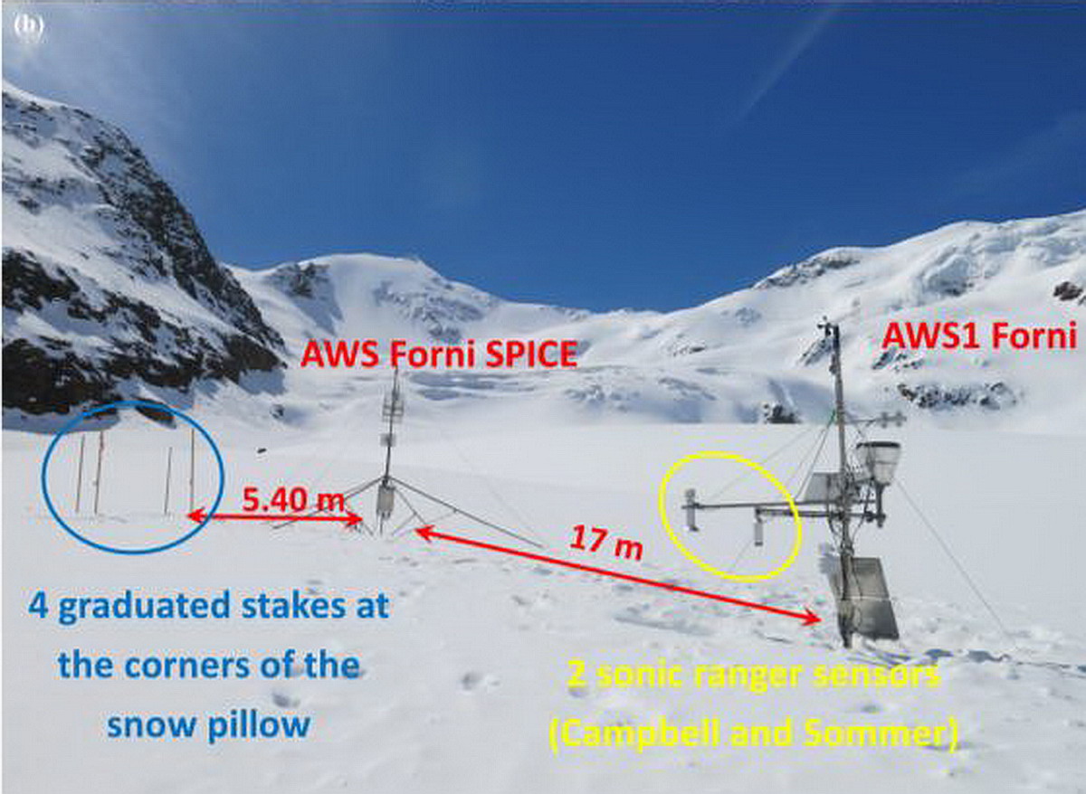 La lunga serie di dati di innevamento ha permesso non solo lo studio sopra descritto ma anche l’inserimento dell’Italia in alcuni fra i più prestigiosi progetti internazionali promossi dall’Organizzazione Meteorologica Mondiale (tra cui i progetti SPICE – Solid Precipitation Intercomparison Experiment e CryoNet – Global Cryosphere Watch) e dal programma Europeo Horizon 2020 (ESSEM COST Action ES1404 – European Cooperation in Science and Technology). Nell’ambito di questi progetti, nel 2014 è stata installata sul Ghiacciaio dei Forni una seconda stazione permanente (AWS Forni SPICE) per permettere una più approfondita e precisa indagine proprio delle precipitazioni nevose.