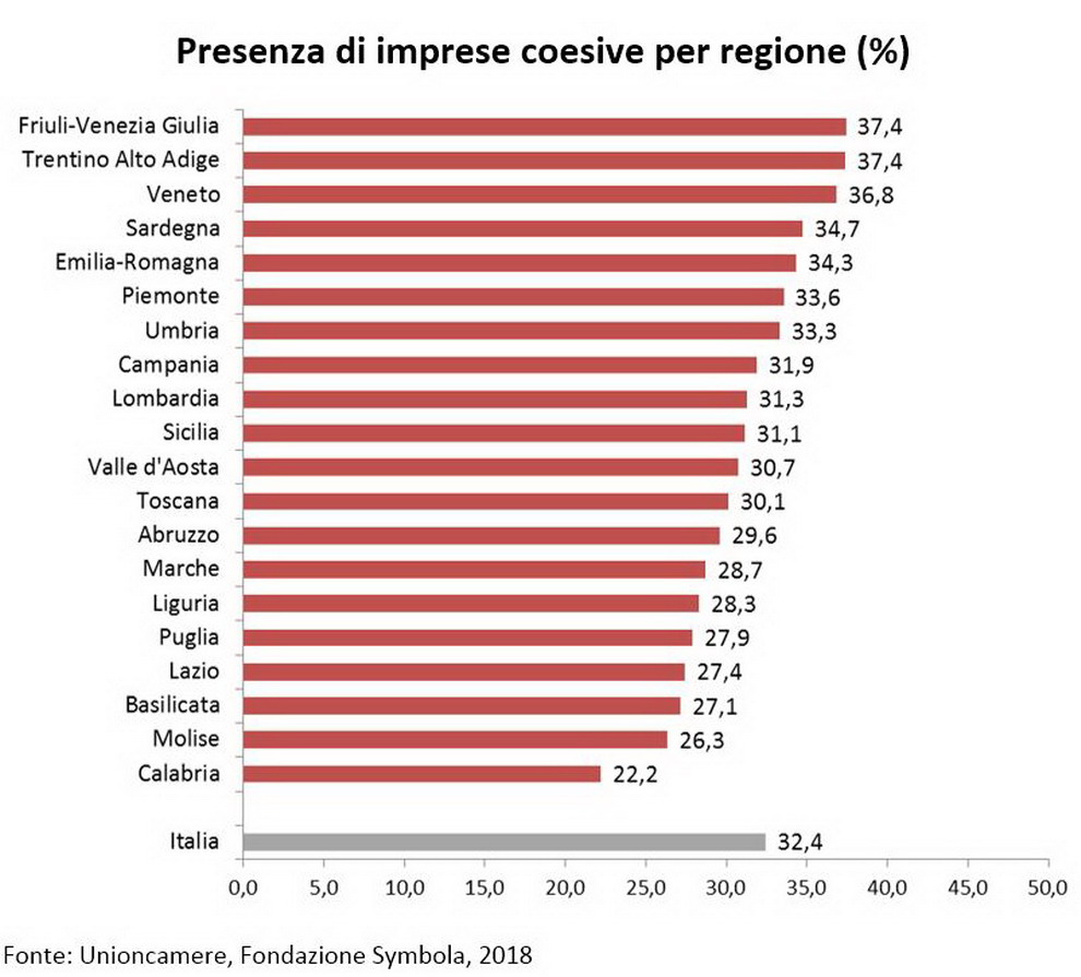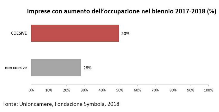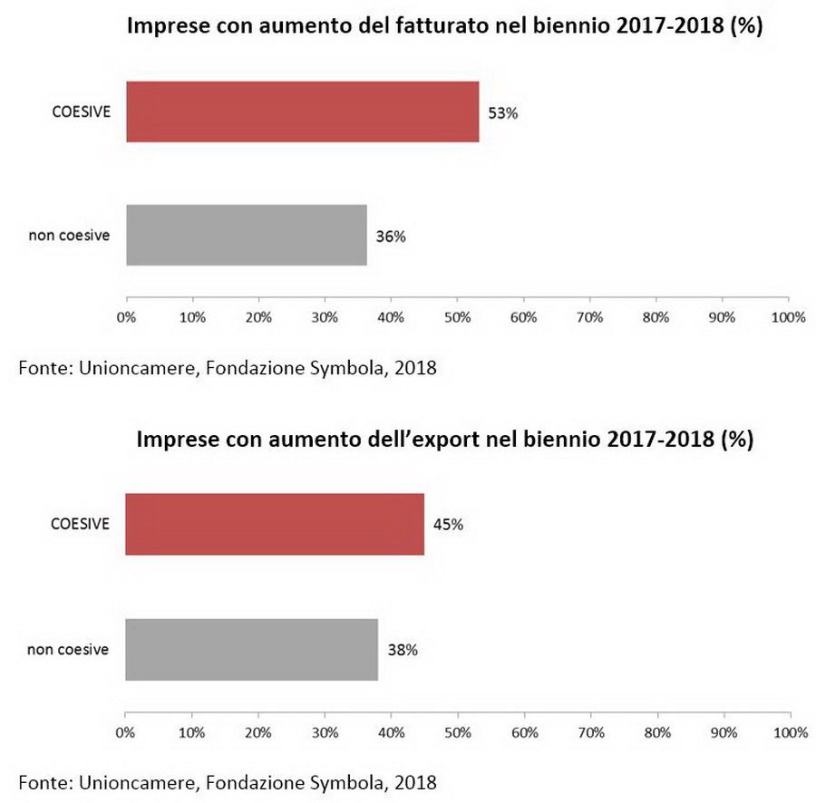 Le imprese «coesive», quelle quindi che intrattengono relazioni strutturate con le altre imprese, le comunità, le istituzioni, i consumatori, il terzo settore, e quindi caratterizzate da un elevato grado di networking, hanno registrato nel periodo 2017-2018 aumenti del fatturato nel 53% dei casi, mentre le «non coesive» si sono attestate su valori più bassi: circa il 36%. Hanno anche dimostrato una migliore dinamicità sul fronte dell’occupazione: il 50% delle imprese coesive ha dichiarato assunzioni in questo periodo, contro il 28% delle altre. Una differenza significativa, particolarmente accentuata nelle piccole imprese. Stessa dinamica per le esportazioni: le realtà coesive hanno aumentato l’export nel 45% dei casi, a fronte del 38% delle non coesive, oltre a essere quelle che registrano una considerazione maggiore di valori come l’ambiente (il 38% delle imprese coesive contro il 21% delle non coesive nel triennio 2015–2017), la creazione di occupazione e di benessere economico e sociale, gli investimenti in qualità (l’82% delle imprese coesive ha fatto social investment contro il 65% delle altre).