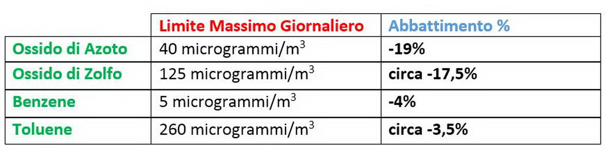 Pur partendo da una situazione sempre ben al di sotto da tali parametri, in circa 180 giorni i pannelli campione installati negli ambienti Guna hanno filtrato e disgregato complessivamente talune sostanze inquinanti tipiche di qualsiasi ambiente lavorativo esposto su una strada a grande scorrimento. Queste le più significative: