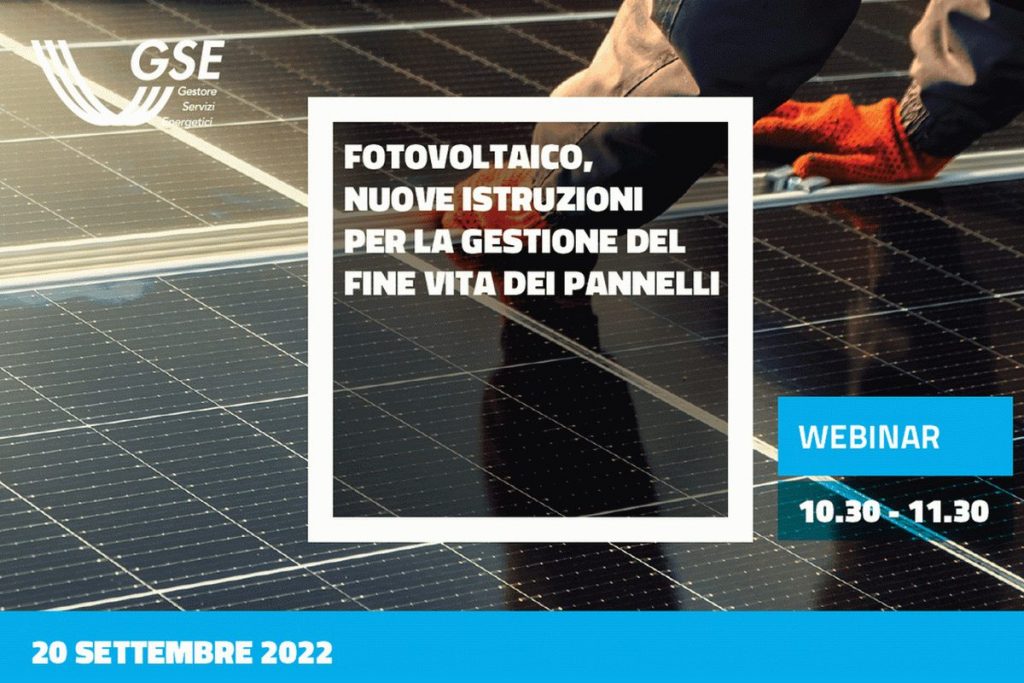 Il prossimo 20 settembre alle ore 10.30 il GSE organizza un Webinar sulle nuove Istruzioni operative per la gestione e lo smaltimento dei pannelli fotovoltaici incentivati.