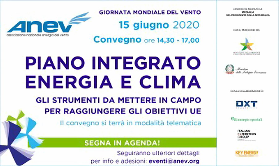 In questa giornata, in molti Paesi del mondo si organizzano eventi e in Italia le varie iniziative promosse ogni anno vengono coordinate da ANEV (Associazione nazionale energia del vento) – con il Patrocinio del Ministero dello Sviluppo economico e del Ministero dell’Ambiente. Nonostante le difficoltà scaturenti dalla pandemia del Covid-19, Anev ha voluto celebrare, anche quest’anno, la Giornata mondiale del vento con un convegno, in modalità telematica, dal titolo «Piano integrato energia e clima. Gli strumenti da mettere in campo per raggiungere gli obiettivi UE»; introdotto dal Presidente Anev Simone Togni, il convegno ha visto la partecipazione di un parterre interessante di relatori come Francesco Vetrò (Presidente GSE), Edoardo Zanchini (vice-Presidente Legambiente), GB Zorzoli (Presidente FREE), Luciano Barra (Capo Segreteria Tecnica Ministero dello Sviluppo economico), Gianni Girotto (Senatore e Presidente della 10ª Commissione permanente Industria, commercio, turismo), Rossella Muroni (Deputata, Commissione VIII Ambiente, Territorio e Lavori Pubblici alla Camera), Gianluca Benamati (Deputato, vice-Presidente Commissione X Attività Produttive, Commercio e Turismo alla Camera) e di Luca Squeri (Deputato Commissione X Attività Produttive, Commercio e Turismo alla Camera).