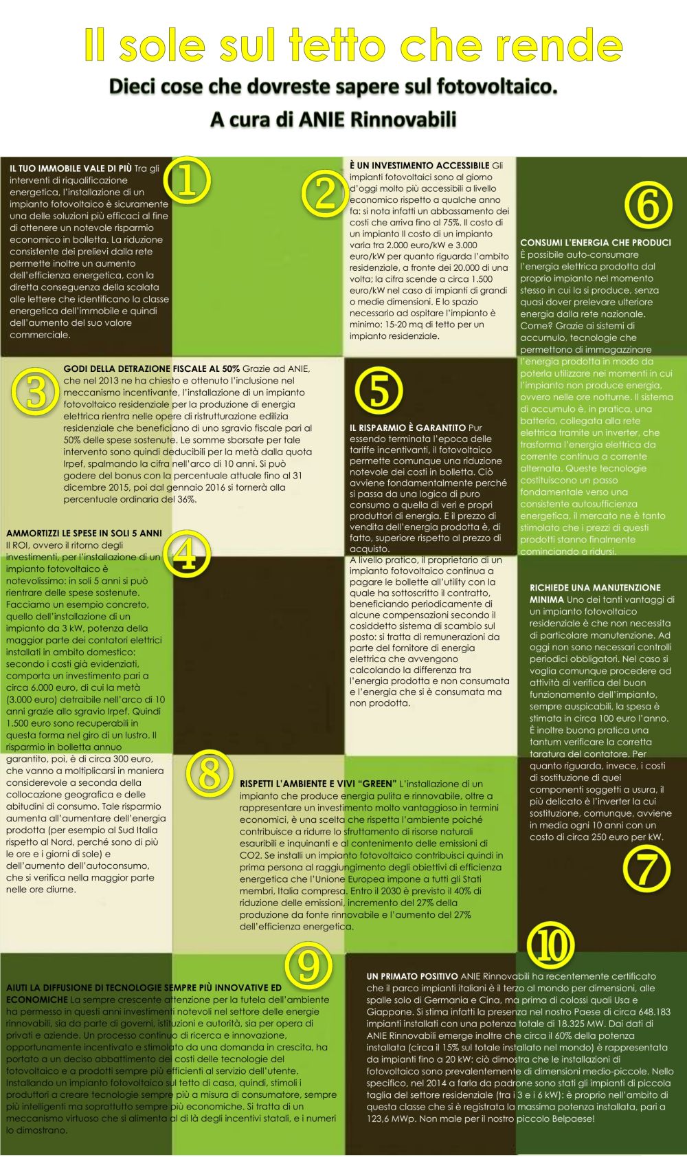 •• Tutto il fotovoltaico possibile in un decalogo, con l’obiettivo di giungere al cuore dei piccoli consumatori e di incentivarli a godere dei poliedrici vantaggi che derivano dall’installazione di un impianto residenziale. L’idea è di ANIE Rinnovabili, l’Associazione che, all’interno di ANIE Federazione, raggruppa le imprese costruttrici di componenti e impianti per la produzione di energia pulita.