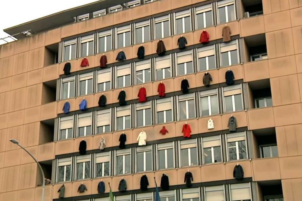 Con 50 cappotti di tutti i colori appesi alla facciata della propria sede romana, ENEA lancia la campagna (di comunicazione istituzionale) «Fai il cappotto al tuo palazzo, usa le detrazioni fiscali del 75%».