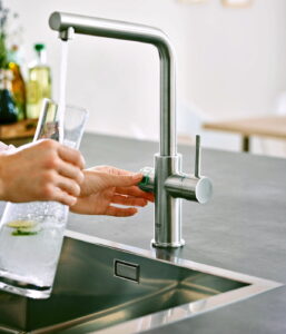 L’impegno nella lotta contro il problema globale dei rifiuti plastici si esprime anche nella produzione di prodotti come GROHE Blue: il sistema di filtrazione finalista del «German Sustainability Award Design 2021» che eroga acqua refrigerata, filtrata e frizzante direttamente dal rubinetto della cucina, eliminando l’utilizzo di bottiglie di plastica.