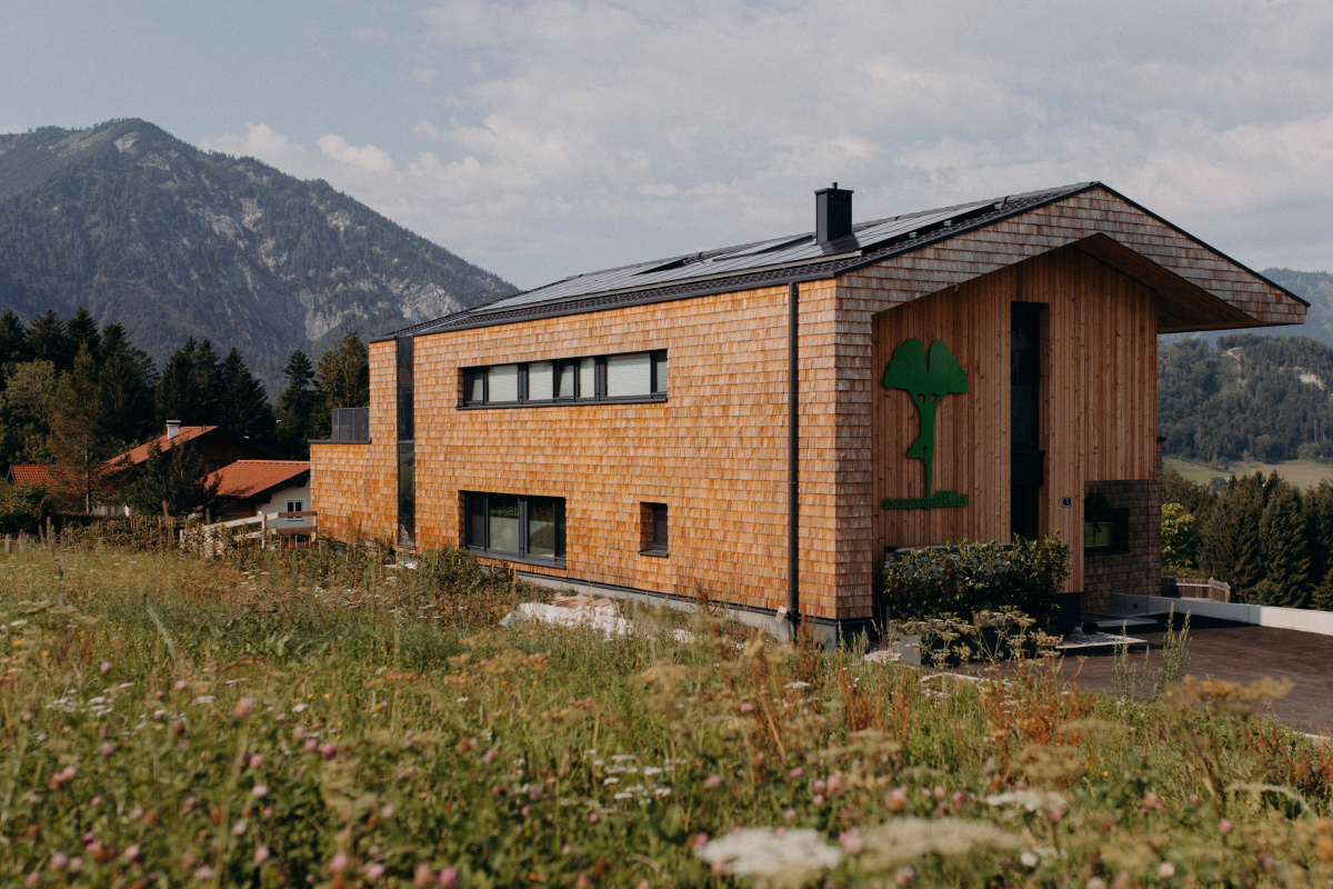 Scandole di larice resistenti agli agenti atmosferici e un rivestimento in larice segato grezzo costituiscono l’involucro edilizio e proteggono le pareti sottostanti in legno massiccio dalle intemperie. Questi rivestimenti contribuiscono alla regolamentazione della temperatura e dell’umidità donando un elevato comfort bioclimatico e un livello eccellente di qualità dell’aria all’interno della struttura.