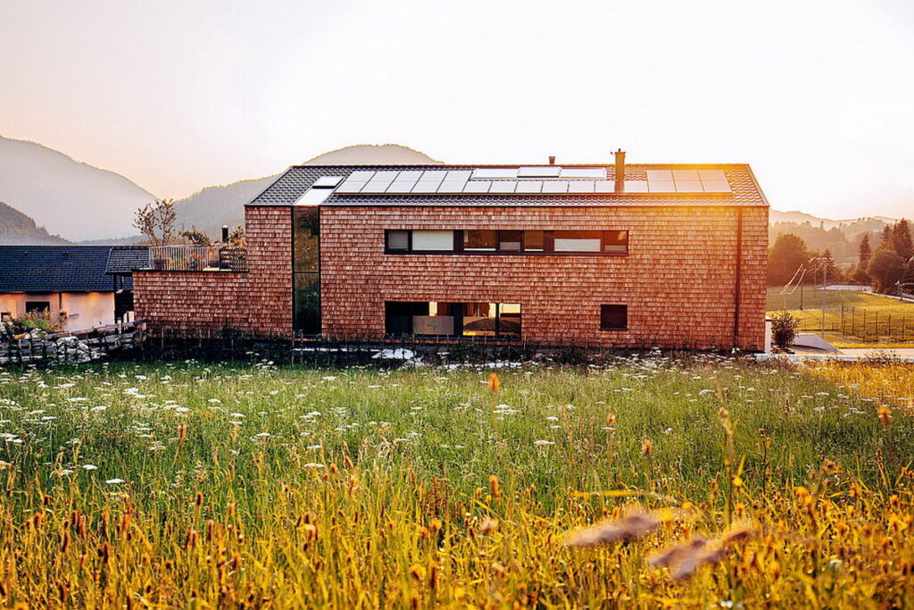 Scandole di larice resistenti agli agenti atmosferici e un rivestimento in larice segato grezzo costituiscono l’involucro edilizio e proteggono le pareti sottostanti in legno massiccio dalle intemperie. Questi rivestimenti contribuiscono alla regolamentazione della temperatura e dell’umidità donando un elevato comfort bioclimatico e un livello eccellente di qualità dell’aria all’interno della struttura.