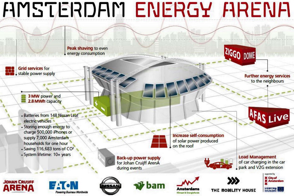 Attraverso questo sistema di accumulo di energia, la neo costituita Amsterdam Energy ArenA BV, sarà in grado sia di utilizzare meglio le proprie fonti rinnovabili sia di scambiare in modo più efficiente l’energia accumulata nelle batterie dei veicoli elettrici”, ha dichiarato Henk van Raan, Direttore innovazione «Johan Cruijff ArenA»L’ArenA si assicura così una notevole quantità di energia, anche durante i black-out. Inoltre, tramite questo sistema, lo stadio contribuirà a stabilizzare la rete elettrica olandese. La Johan Cruijff ArenA è uno degli stadi più sostenibili al mondo e apre la strada a innovazioni intelligenti come questo innovativo impianto”.