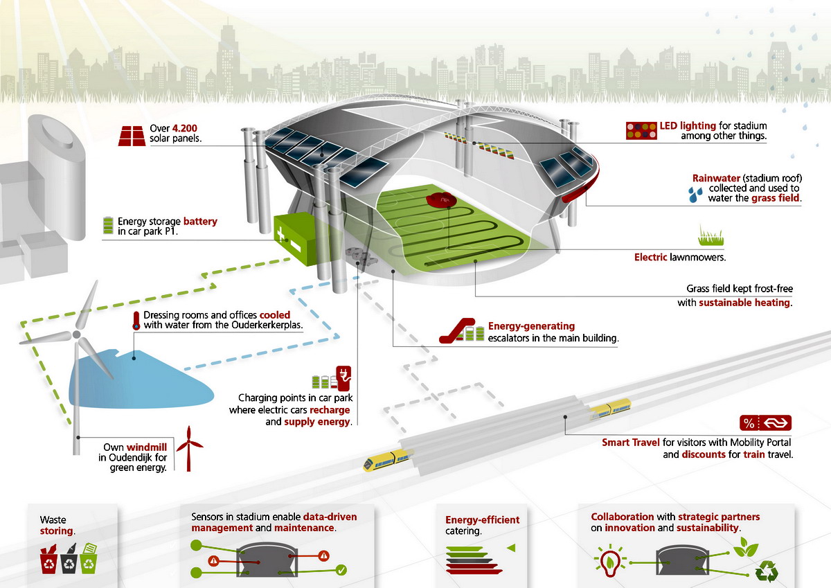 Il nuovo sistema di stoccaggio energetico dello stadio e la nuova azienda, Amsterdam Energy ArenA BV, sono il risultato concreto del programma innovativo condotto dall’Amsterdam Innovation Arena, a cui le Istituzioni, Governi e aziende stanno lavorando per lo sviluppo e l’implementazione dello stadio del futuro. Lo stadio e l’area adiacente rivestono il ruolo di Living Lab, un centro nevralgico in cui provare in prima persona le innovazioni. La Johan Cruijff ArenA International diventa quindi la piattaforma tramite cui testare concept innovativi, nuove soluzioni comprovate nel campo della costruzione, della gestione e dell’utilizzo degli stadi.