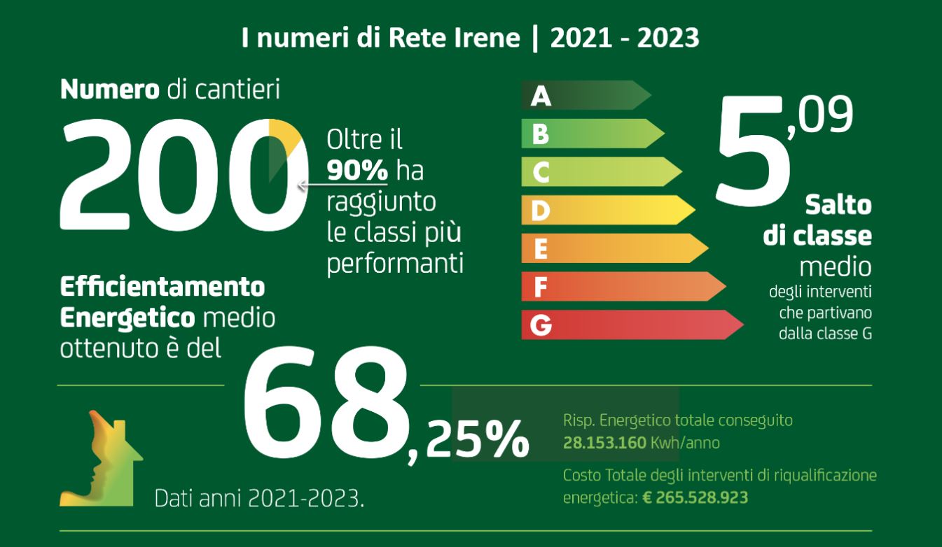 Il protocollo, creato nel 2019, ha anticipato le disposizioni della Direttiva europea sulle Case Green. Il network di imprese Rete Irene ha portato avanti 200 interventi di riqualificazione energetica, con un’efficienza media del 68% e un miglioramento di 5 classi energetiche, generando un risparmio annuale di 28 milioni di kWh. A fronte di un investimento di circa 265 milioni di euro nel triennio 2021-2023.