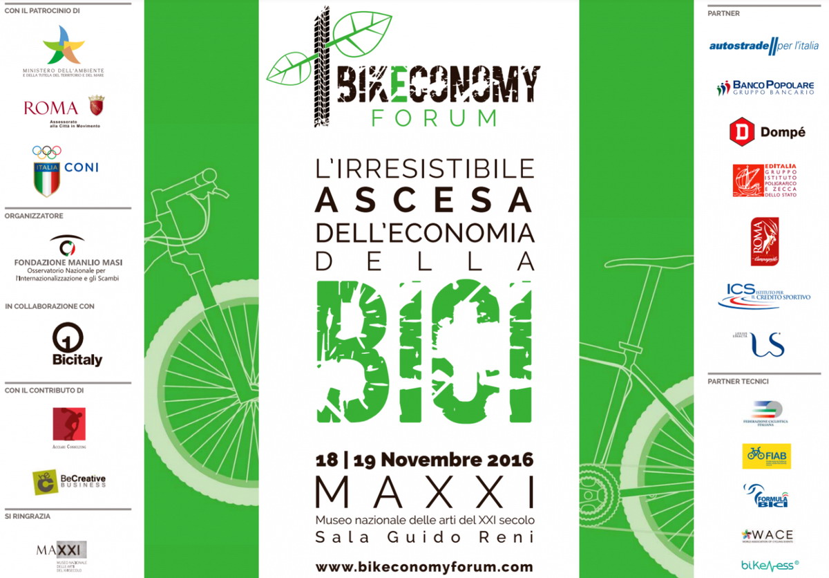 Infrastrutture per la mobilità sostenibile, nuova economia, innovazione e design. Questi i temi che «circolano» intorno alla bicicletta, nella terza edizione del Forum sulla Bikeconomy che si svolgerà il 16 novembre a Roma presso il Museo MAXXI, ideato dalla Fondazione Manlio Masi e Osservatorio Bikeconomy, con il Patrocinio della Regione Lazio, di Roma Capitale, del Coni e della Federazione Ciclistica Italiana.