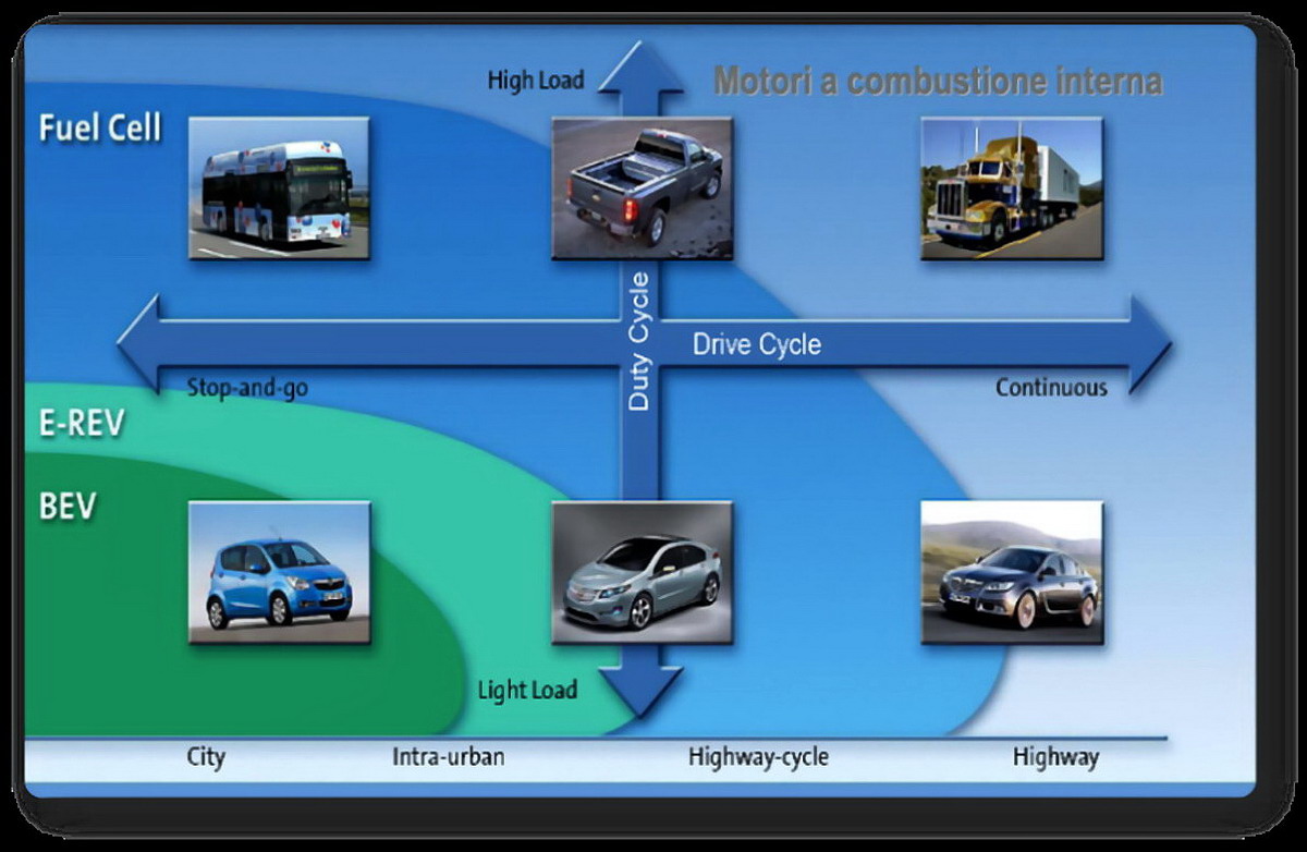 Nella figura in ascisse è la tipologia del ciclo stradale (urbano, extra-urbano, autostradale), riconducibile all’autonomia richiesta, in ordinata il consumo energetico in valore assoluto (duty cycle), riconducibile alla taglia. La suddivisione tra le diverse zone è, ovviamente, indicativa ed oltretutto il grafico è abbastanza vecchio, per cui oggi andrebbe ristretta la zona di pertinenza dell’idrogeno a vantaggio di quella dei veicoli a batteria, ma è comunque interessante anche per chiarire il concetto della complementarietà delle diverse tipologie di motorizzazione.