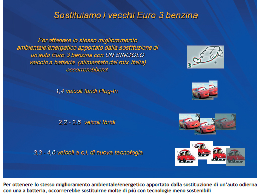 Un confronto di «ecosostenibilità complessiva» in termini quantitativi, condotto dalla Commissione CIVES del CEI, dimostra per esempio che la valenza globale di un’auto a batteria può essere quasi cinque volte superiore a quella di veicoli Euro5 o Euro6 e almeno il doppio rispetto a un’ibrida non ricaricabile. Assumendo ragionevolmente che ai tre fattori citati – gas serra, effetti delle emissioni sulla salute e consumi energetici – possa essere attribuita la medesima importanza, si giunge ai risultati indicati in figura (sotto), che esprime sinteticamente il miglioramento complessivo che ciascuna opzione «ecologica» porterebbe già oggi al quadro ambientale/energetico qualora andasse a sostituire delle vetture a benzina Euro3 dell’attuale generazione. E il quadro – già radicalmente a favore degli elettrici – migliorerebbe ulteriormente, e in modo automatico, man mano che per la produzione di energia elettrica verrà usata una quota crescente di energie rinnovabili.