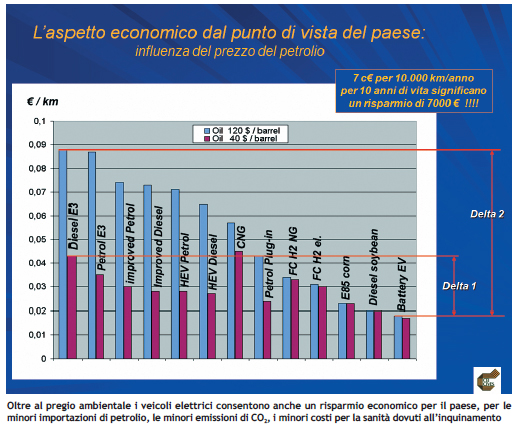 Infatti, sommando assieme il valore economico delle minori emissioni di gas serra (oggi nel trading internazionale una tonnellata di CO2 non emessa «vale » più o meno 15 euro), il saldo positivo della differenza di costo tra le fonti primarie necessarie a produrre l’elettricità per i veicoli elettrici e il petrolio risparmiato, e infine i minori costi sociali della sanità imputabili all’inquinamento (il PM10 «costa» più o meno 100-400 euro al chilogrammo), si scopre che il chilometro di un veicolo elettrico permetterebbe alla collettività di risparmiare anche 7 centesimi di euro rispetto a un veicolo tradizionale; il che significa che, nei suoi 10.000 chilometri annui per 10 anni di vita, ogni auto elettrica porterebbe un risparmio di più o meno 6.000 euro. Denaro che, in una logica cartesiana, potrebbe almeno in parte essere anticipato adesso per stimolare e sostenere la concreta penetrazione di questi veicoli nel tessuto della nostra mobilità.