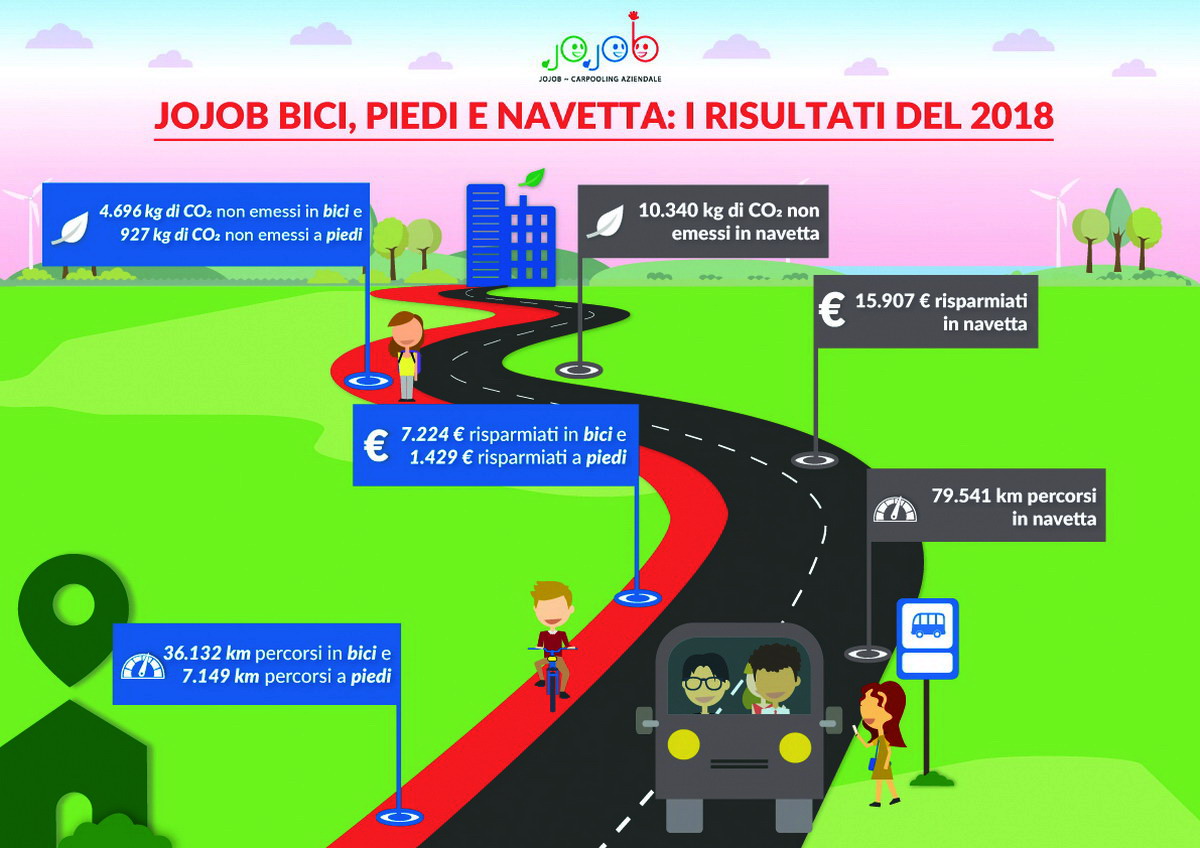 Oltre 650.000 euro risparmiati e 420 tonnellate di CO2 non emesse semplicemente rinunciando all’auto privata, sono le cifre record emerse dal Rapporto sulla Mobilità Sostenibile Aziendale 2018 elaborato da Jojob.