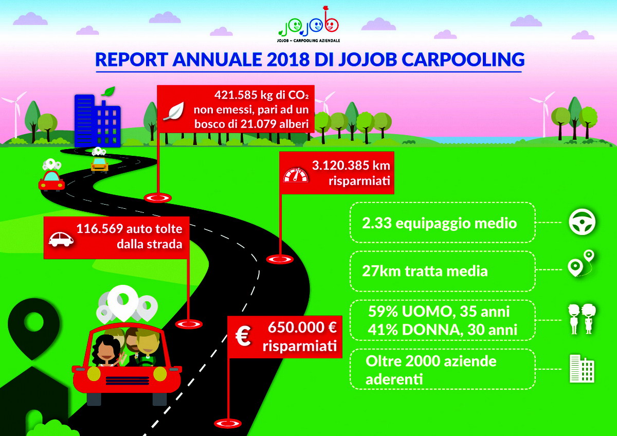 Il numero di aziende che scelgono il carpooling aziendale di Jojob come soluzione e opzione per i propri dipendenti é salito a oltre 2.000 (+15% sul 2017), di cui 180 sono grandi aziende, che oltre al servizio di carpooling aziendale stanno introducendo o sperimentando anche gli incentivi per i dipendenti che certificano gli spostamenti a piedi, in bici o con la navetta.