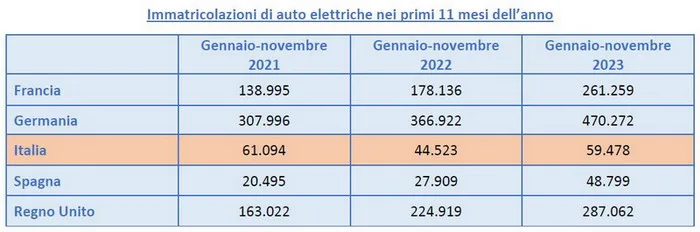 Prendendo in considerazione i dati che vanno dal Gennaio al Novembre del 2023, le quote delle elettriche in Italia si fermano al 4,1% delle vendite totali. Sapete cosa succede in Spagna? Beh nulla di significativamente migliore, siamo fermi al 5,6%. Laddove invece c’è un netto distacco, a volte quasi quintuplicando il dato italiano, è in Francia e Germania. I cugini d’oltralpe fanno segnare un 16,4%, mentre i tedeschi salgono sul gradino più alto del podio con un 18,1%.