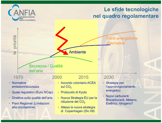Volendo sintetizzare le principali sfide tecnologiche che il nostro settore dovrà affrontare nel prossimo futuro, dobbiamo concentrarci sul tema della sicurezza – attiva, passiva e preventiva -, dell’ambiente, che richiederà il massimo impegno soprattutto nell’affrontare la sfida delle emissioni di CO2, e sull’efficienza energetica, che possiamo interpretare come giusto trade off tra una spinta all’innovazione dei motori termici e un orientamento deciso allo sviluppo di tecnologie ibride ed elettriche. Queste sfide tecnologiche si inseriscono in un quadro normativo e regolamentare particolarmente «pesante» per il nostro settore, che oggi appare ancor più gravoso a causa di un contesto economico fortemente critico: agli ingenti costi di investimento richiesti, si aggiunge la difficoltà di sopravvivere alla crisi economico-finanziaria in corso, gettando contemporaneamente le basi per la competitività futura. Nel recente passato, a partire dall’introduzione della normativa Euro1 nel 1993 fino alla fissazione dei limiti Euro6 previsti per il 2015, e con le normative in materia di sicurezza, l’Europa ha richiesto alla propria filiera automobilistica lo sforzo maggiore a confronto con la filiera americana o asiatica.