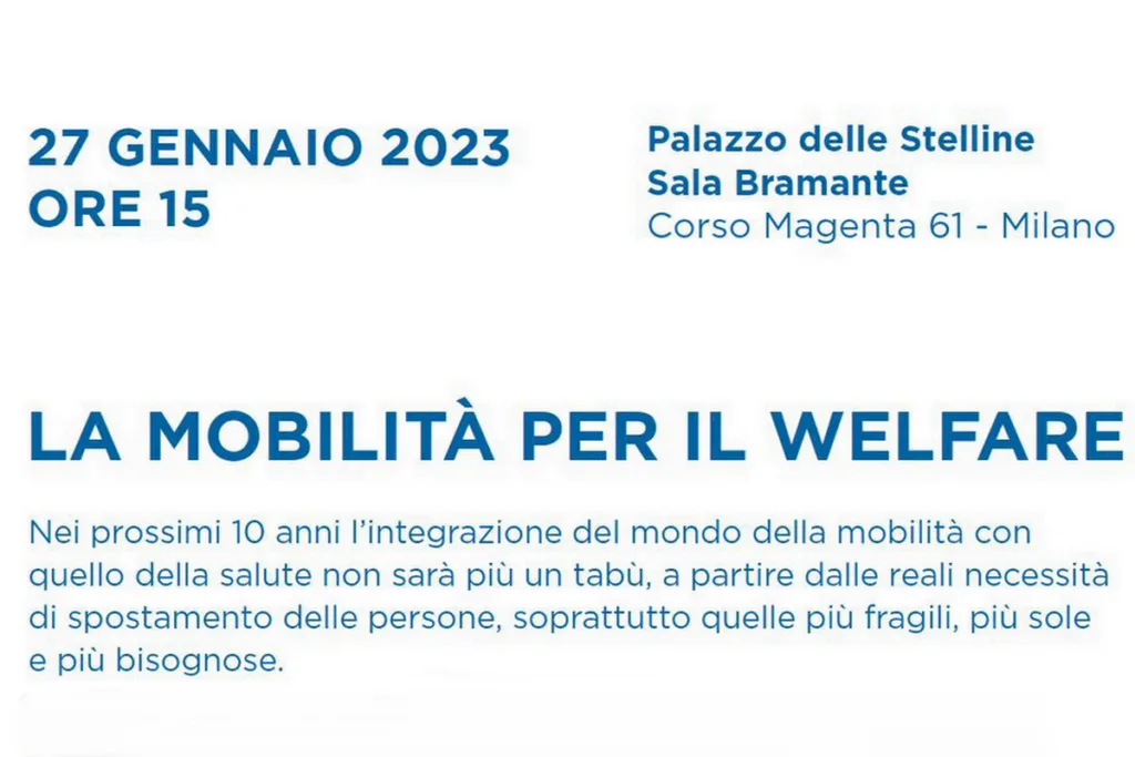 Domani 27 gennaio 2023 a Milano, alle ore 15.00, presso il Palazzo delle Stelline (Corso Magenta n.61) Sala Bramante, si terrà il convegno «La mobilità per il Welfare». La conferenza si pone l’obiettivo di esplorare l’integrazione sempre più necessaria tra mobilità e il mondo della salute, a partire dalle reali necessità di spostamento, soprattutto delle persone più fragili.