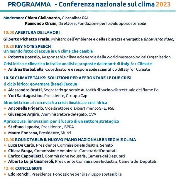 - la seconda vede un confronto fra amministrazioni e imprese per discutere di sfide e soluzioni in tre settori chiave nell’ambito del legame fra acqua e clima, ovvero ciclo idrico, agricoltura e idroelettrico