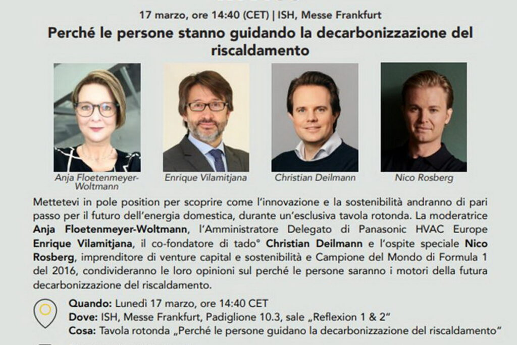 Alla fiera ISH di Francoforte, tado° sarà presente quest’anno insieme a Panasonic. Alla tavola rotonda che si terrà lunedì 17 marzo alle ore 14:40 si affronterà il tema della decarbonizzazione nel settore del riscaldamento e vedrà la partecipazione di: