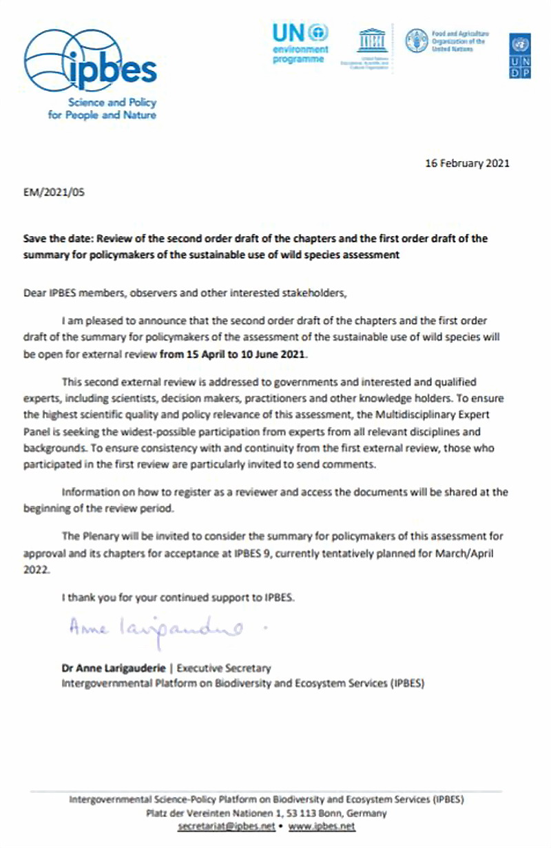 L’Intergovernmental Science-Policy Platform on Biodiversity and Ecosystem Services (IPBES) con la notifica EM/2021/05 di seguito riportata, ha annunciato che dal 15 aprile al 10 giugno 2021 sarà possibile partecipare alla seconda revisione delle bozze dei capitoli e della sintesi, per i responsabili politici, del documento di valutazione dell’uso sostenibile delle specie selvatiche.
