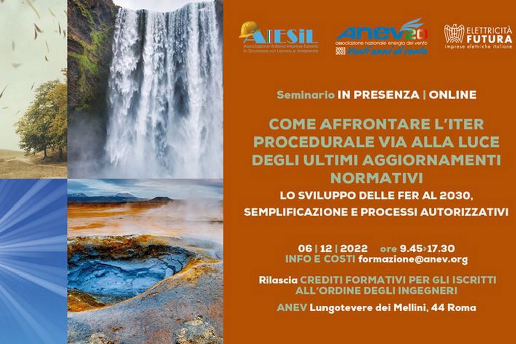 Il seminario formativo, organizzato da ANEV ed Elettricità Futura, è finalizzato ad approfondire gli aspetti normativi e procedurali, a livello nazionale e regionale, delle varie fasi che caratterizzano la valutazione d’impatto ambientale per la realizzazione o la modifica di impianti a fonti rinnovabili, alla luce degli importanti obiettivi di sviluppo attesi per i prossimi anni e degli indirizzi politico/normativi conseguenti.