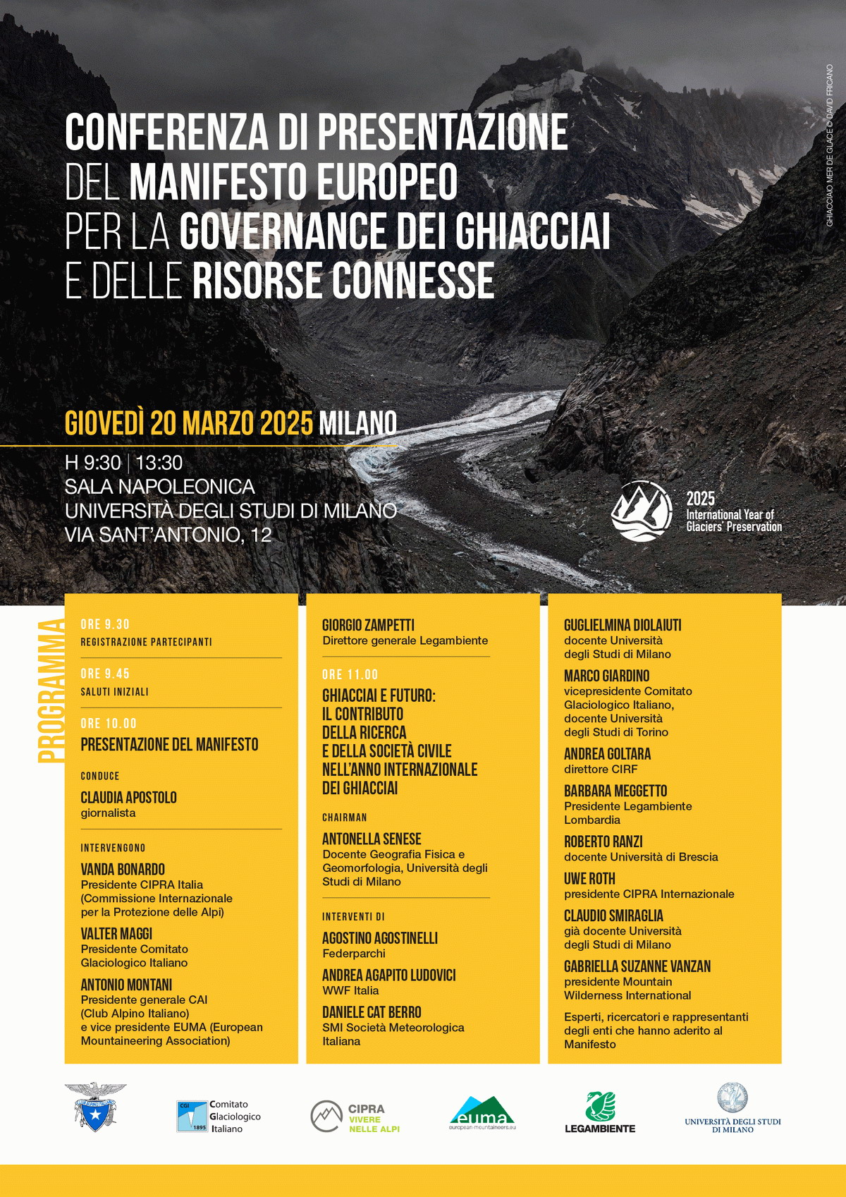 Giovedì 20 marzo 2025, presso la Sala Napoleonica dell’Università degli studi di Milano, in Via Sant’Antonio n. 12, si terrà dalle ore 9:30 alle 13:30 la Conferenza di presentazione del Manifesto europeo per la governance dei ghiacciai e delle risorse connesse. Patrocinatori: Club Alpino Italiano (CAI) – Comitato Glaciologico Italiano – Commissione Internazionale per la Protezione delle Alpi (CIPRA) – European Mountaineering Association (EUMA) – Legambiente – Università degli Studi di Milano.