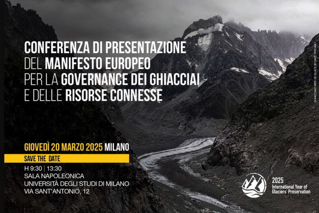 Giovedì 20 marzo 2025, presso la Sala Napoleonica dell’Università degli studi di Milano, in Via Sant’Antonio n. 12, si terrà dalle ore 9:30 alle 13:30 la Conferenza di presentazione del Manifesto europeo per la governance dei ghiacciai e delle risorse connesse. Patrocinatori: Club Alpino Italiano (CAI) – Comitato Glaciologico Italiano – Commissione Internazionale per la Protezione delle Alpi (CIPRA) – European Mountaineering Association (EUMA) – Legambiente – Università degli Studi di Milano.
