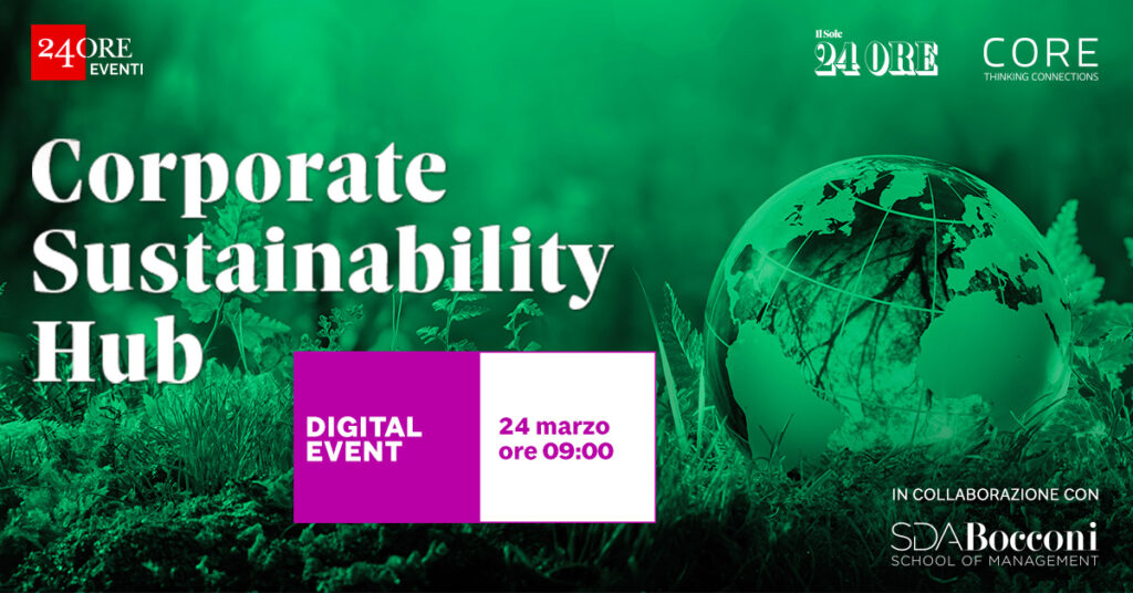 Per analizzare e valorizzare le best practice nell’ambito della green economy attuate da aziende di diversi settori merceologici, Il Sole 24 Ore e Core, in collaborazione con SDA Bocconi School of Management, organizzano giovedì mattina 24 marzo l’evento “Corporate Sustainability Hub”, appuntamento digitale che si pone come obiettivo la valorizzazione delle migliori pratiche messe in campo dalle aziende in termini di sostenibilità ambientale, economica e sociale.