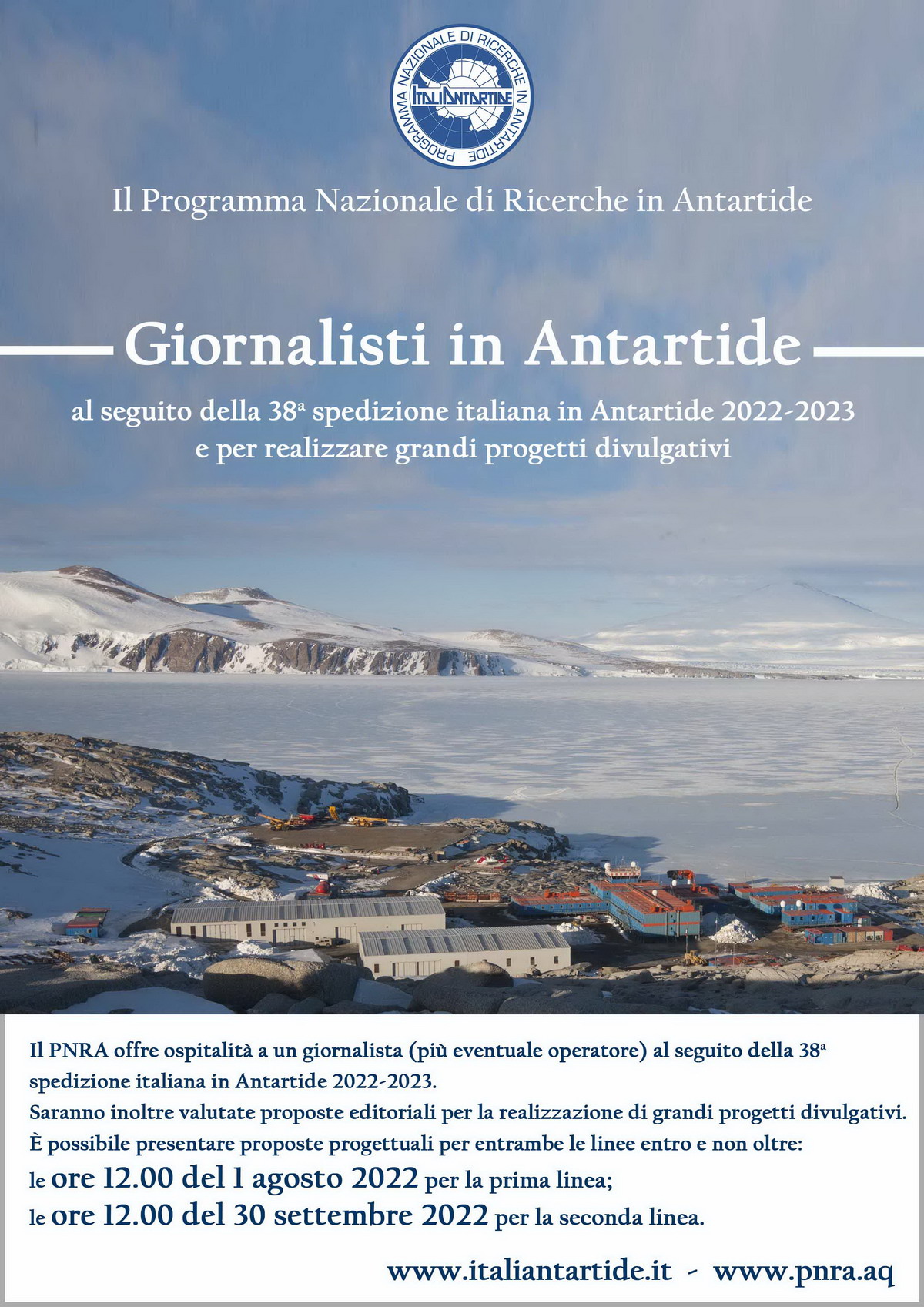 ENEA ha annunciato, dopo due spedizioni antartiche condotte con grandi limitazioni imposte dalla pandemia, la riapertura della call del Programma Nazionale di Ricerche in Antartide (PNRA) per la selezione di un giornalista (più eventuale operatore) che sarà ospitato per circa 15 giorni tra ottobre/novembre 2022 presso le stazioni di Mario Zucchelli/Concordia o in alternativa per circa 30-40 giorni nel mese di gennaio 2023 sulla nave oceanografica Laura Bassi.