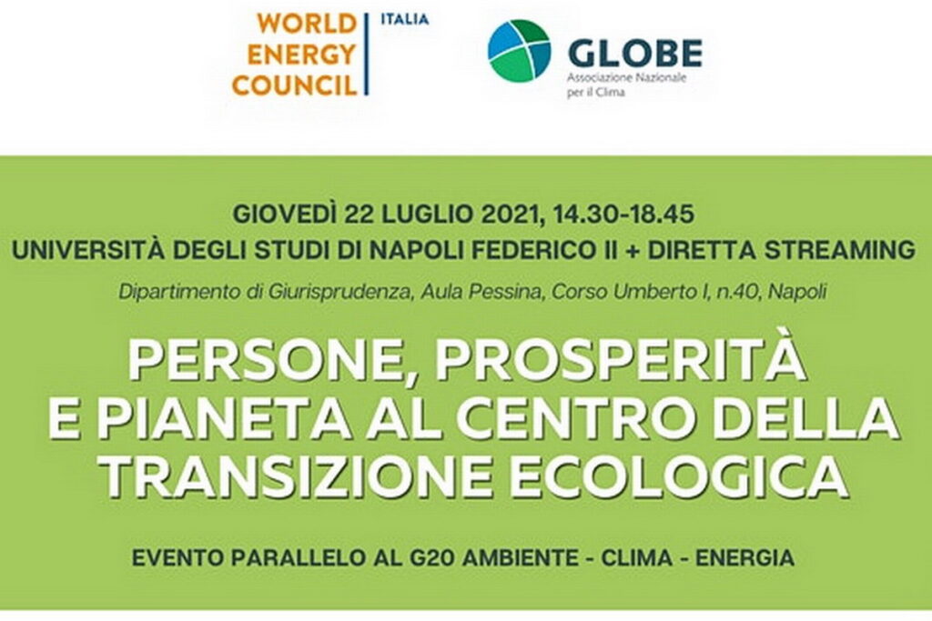 Alle 14.30 presso la sede storica della Facoltà di Giurisprudenza dell’Università Federico II di Napoli (Corso Umberto I, n.40) l’evento “”, parallelo del G20 «Ambiente Energia e Clima» di Napoli organizzato da WEC Italia (Comitato nazionale italiano del Consiglio Mondiale dell’Energia) e da Globe Italia (Associazione Nazionale per il Clima) in collaborazione con la cattedra di Diritto dell’energia dell’ateneo campano.