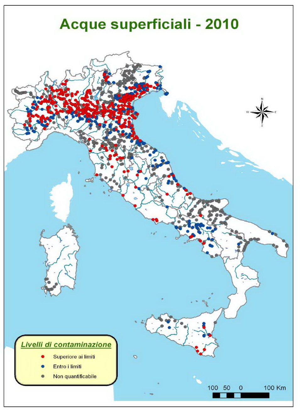 Un passo indietro rispetto al passato se si verifica il livello di contaminazione delle acque italiane superficiali e sotterranee: nel 2010 sono stati rinvenuti residui nel 55,1% dei 1.297 punti di campionamento delle acque superficiali e nel 28,2% dei 2.324 punti di quelle sotterranee, per un totale di 166 tipologie di pesticidi, contro le 118 del biennio 2007-2008, individuate nella rete di controllo ambientale delle acque italiane. La maggior parte sono residui di prodotti fitosanitari usati in agricoltura – solo in questo campo si utilizzano circa 350 sostanze diverse per un quantitativo superiore a 140.000 tonnelate – ma anche di biocidi (pesticidi per uso non agricolo) impiegati in vari campi di attività. Anche se spesso basse, le concentrazioni indicano complessivamente una diffusione molto ampia della contaminazione.