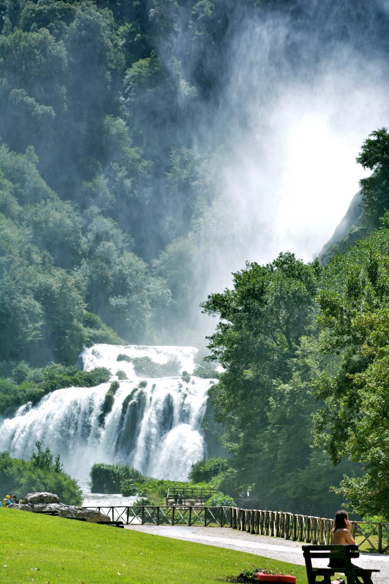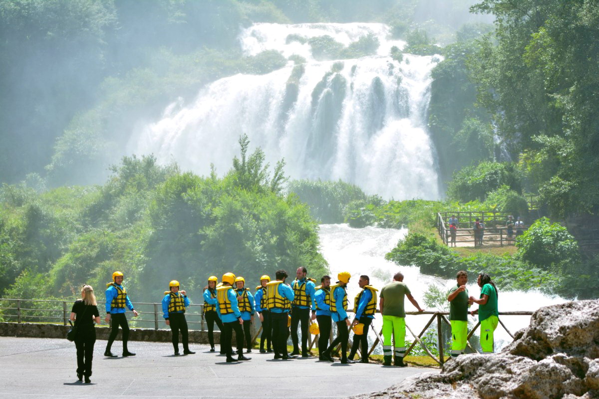 Finita la lezione teorico-pratica di un’ora i partecipanti – indossati muta in neoprene, l’aiuto al galleggiamento «salvagente», le scarpe in neoprene, il casco e la «giacca d’acqua» forniti dall’organizzazione – vengono accompagnati con un pulmino proprio sotto la Cascata delle Marmore. Il paesaggio è di quelli mozzafiato. A un passo dal salto più alto ti accoglie una nuvola di goccioline e la voce assordante del fiume che preannuncia tutta l’emozione del percorso. Qui il fiume Nera scorre infatti veloce, ribollendo sulle rocce per oltre tre chilometri, formando rapide di quarto grado (da 1 a 6 le difficoltà del rafting), contornato da una vegetazione rigogliosa, in un ambiente che sembra tropicale.