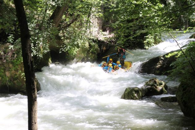 Gli equipaggi scendono verso il fiume percorrendo uno stretto sentiero e sui margini in fila indiana tre gommoni aspettano i partecipanti (sei per ogni mezzo). Avanti ad ogni gommone un istruttore a bordo di un hydrospeed fa da apripista al convoglio, pronto ad intervenire in caso di emergenza. Da questo suggestivo luogo inizia l’avventura.