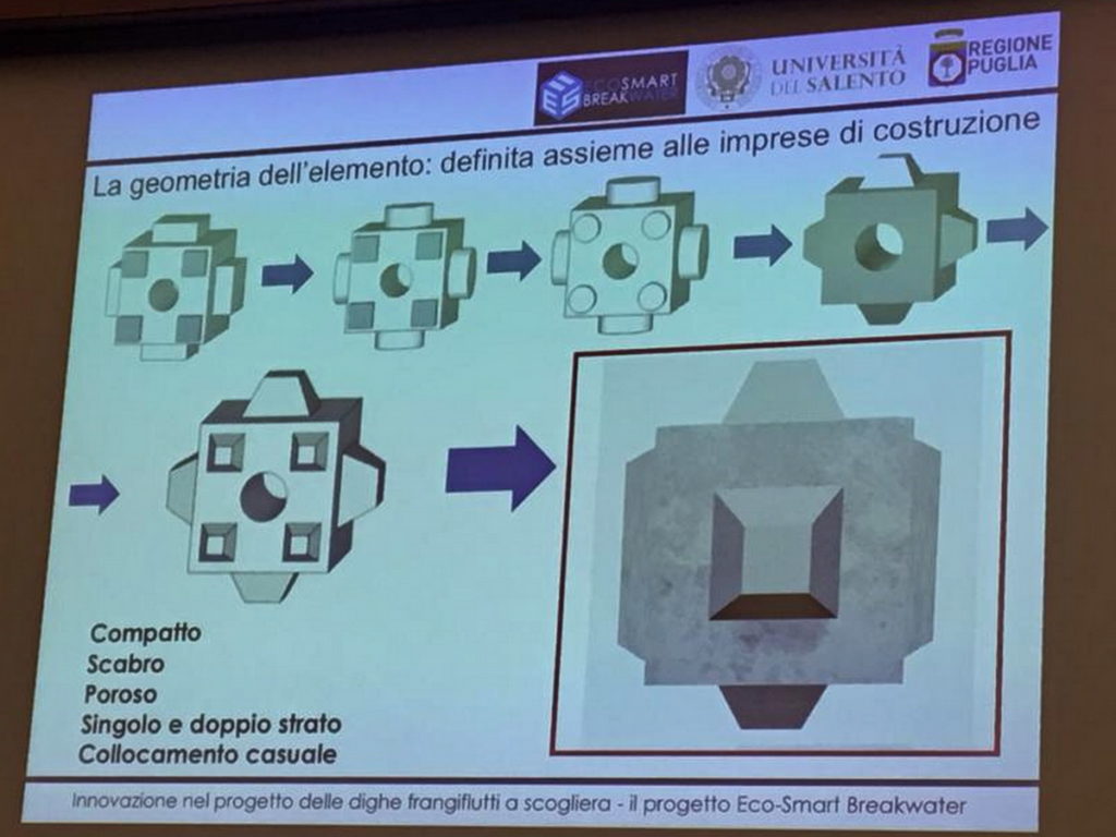 Il progetto, che è attualmente in fase di sperimentazione nel porto di Otranto, dove sono stati collocati i primi tre massi campione, ha tra gli obiettivi lo sviluppo di una miscela di calcestruzzo cementizio eco-sostenibile che integra resti di posidonia oceanica spiaggiata e aggregati riciclati, realizzando un nuovo elemento in calcestruzzo cementizio per la formazione delle dighe marittime a scogliera di difesa dei porti o a difesa delle coste dall’erosione.